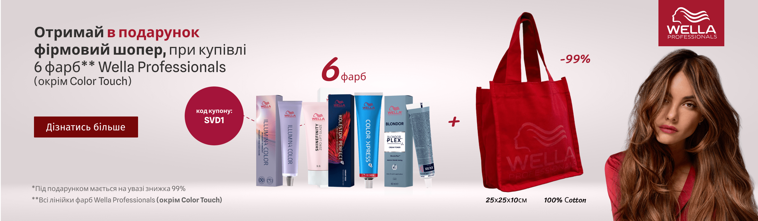 1. Додайте в кошик 6 будь-яких фарб Wella Professionals (SHINEFINITY, Illumina Color, Opal-Essence by Illumina Color, Koleston Perfect, Color XPRESS, Color Fresh Create, Blondorplex Cream Toner). Зверніть увагу COLOR TOUCH не приймає участь в акції!