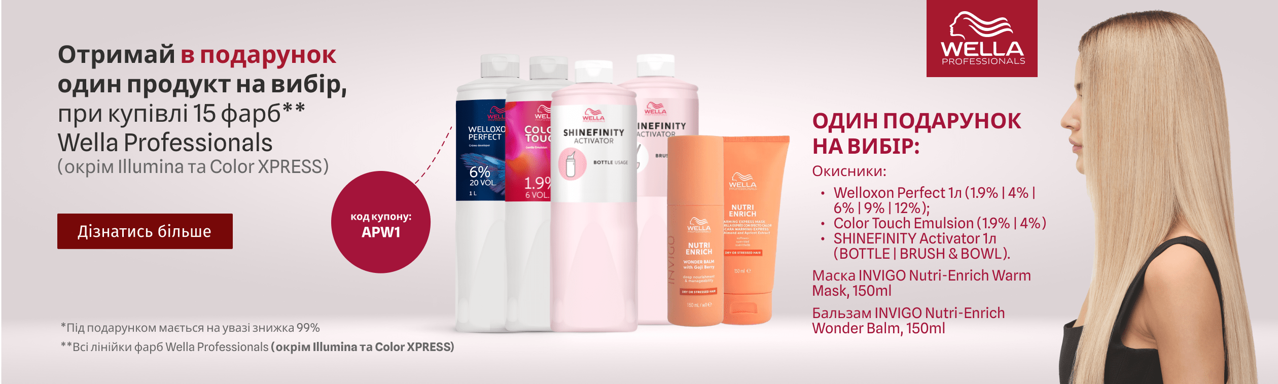 - Додайте в кошик 15 будь-яких фарб Wella Professionals (SHINEFINITY, Color Touch, Koleston Perfect, Color Fresh Create, Blondorplex Cream Toner). Зверніть увагу Illumina Color та Сolor XPRESS не приймає участь в акції!